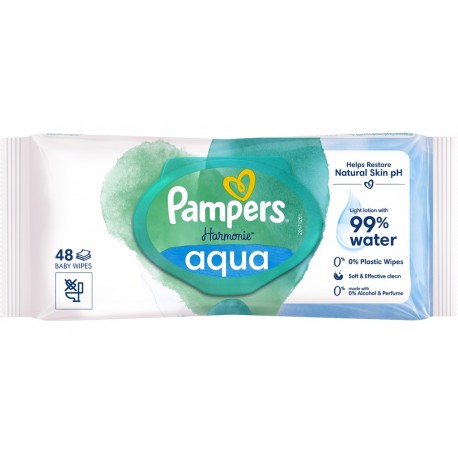 Skóra noworodków jest bardzo delikatna i dlatego wymaga łagodnej pielęgnacji, począwszy od zmiany pieluszki. Chusteczki nawilżane Pampers Harmonie Aqua zawierają 99% wody, dzięki czemu zapewniają doskonałą ochronę skóry. Nie zawierają tworzyw sztucznych i zostały wykonane z najwyższej jakości bawełny: włókna w 100% pochodzenia roślinnego.