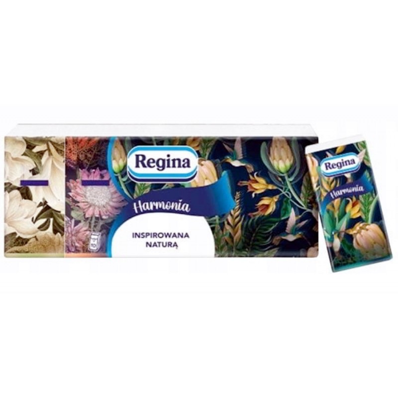 Regina Harmonia to miękkie, 3-warstwowe chusteczki w nowoczesnych opakowaniach inspirowanych naturą. Wyjątkowa grafika oraz starannie dobrane kolory z łatwością przypadną do gustu konsumentom, doskonale dopasują się do każdego wnętrza i na stałe zagoszczą w torebkach jako wersja kieszonkowa. Te bogato zdobione opakowania w czterech różnych wzorach pozwolą dobrać odpowiedni wariant dla każdego.