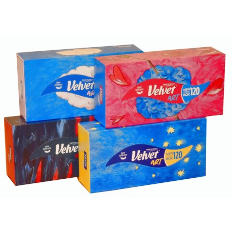 Nowa linia Velvet ART to miękkie i wytrzymałe 3-warstwowe chusteczki uniwersalne wykonane w 100% z celulozy, zamknięte w pięknych pudełkach o unikalnej grafice. Każda z czterech propozycji tworzy wyjątkowe połączenie abstrakcyjnych i modnych wzorów, złocistych elementów dekoracyjnych oraz stonowanej kolorystyki kartoników, przełamanych charakterystycznym, nieco bardziej wyrazistym frontem wyposażonym w okienko do wyciągania chusteczek.