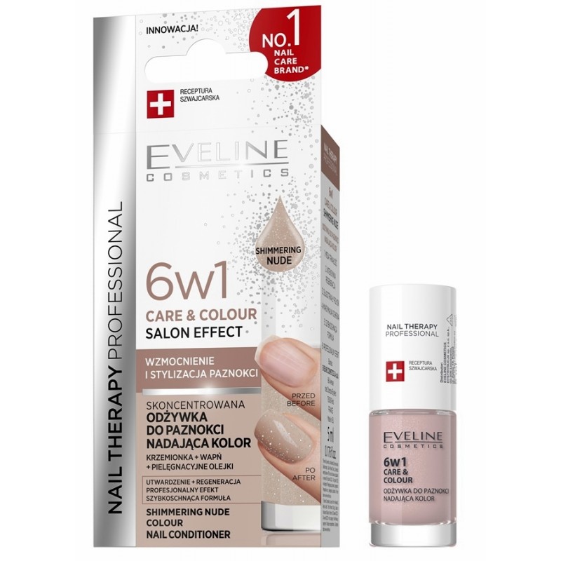 Skoncentrowana odżywka do paznokci Eveline Nail Therapy 6w1 zawierająca kompleks Colour & Double Strong™ wnika w strukturę paznokcia, dzięki czemu zawarte w niej krzemionki, wapń i pielęgnacyjne olejki dogłębnie odżywiają, zapewniając skuteczną pielęgnację. Lakier chroni przed uszkodzeniami mechanicznymi, odpryskiwaniem i ścieraniem. Szybko schnie i zapewnia długotrwały efekt, jak z profesjonalnego studia!