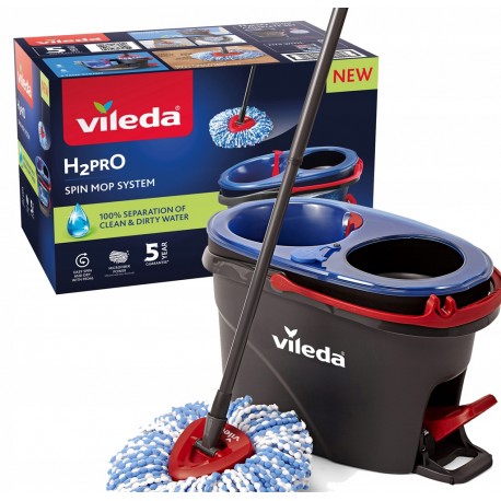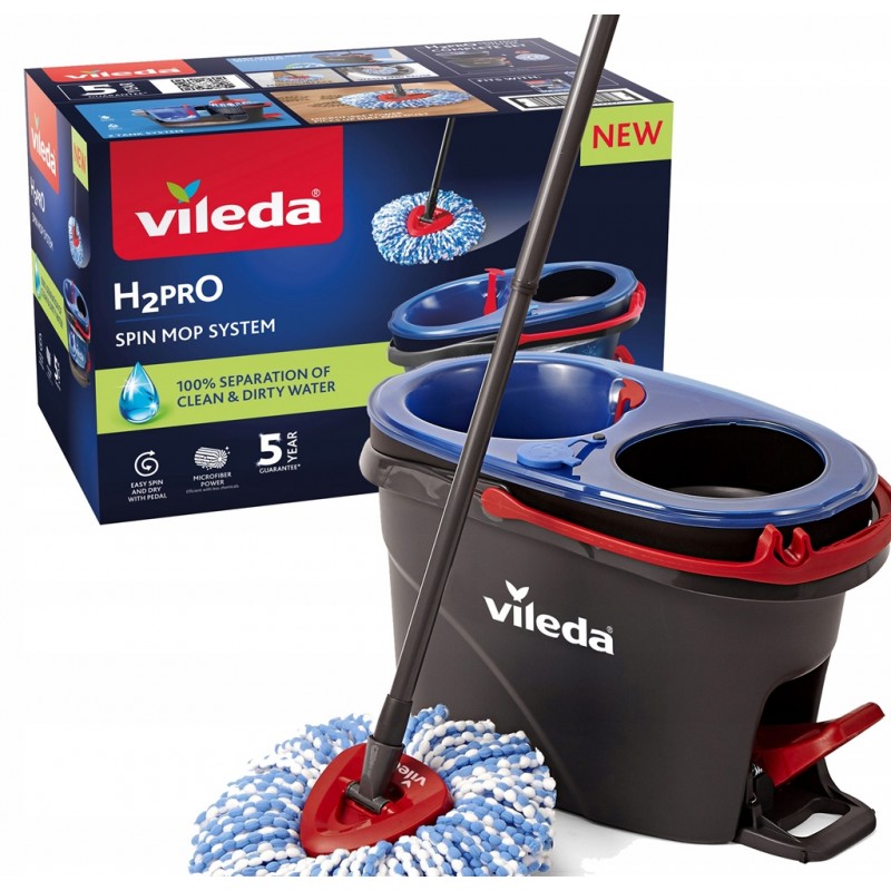 Ten innowacyjny system Vileda wykorzystuje dwukomorową technologię wiadra, która oddziela czystą wodę od brudnej. Vileda H2prO wyposażony jest w system odwirowujący nadmiar wody, który umożliwia bezdotykowe wyciskanie mopa i kontrolowanie jego wilgotności.